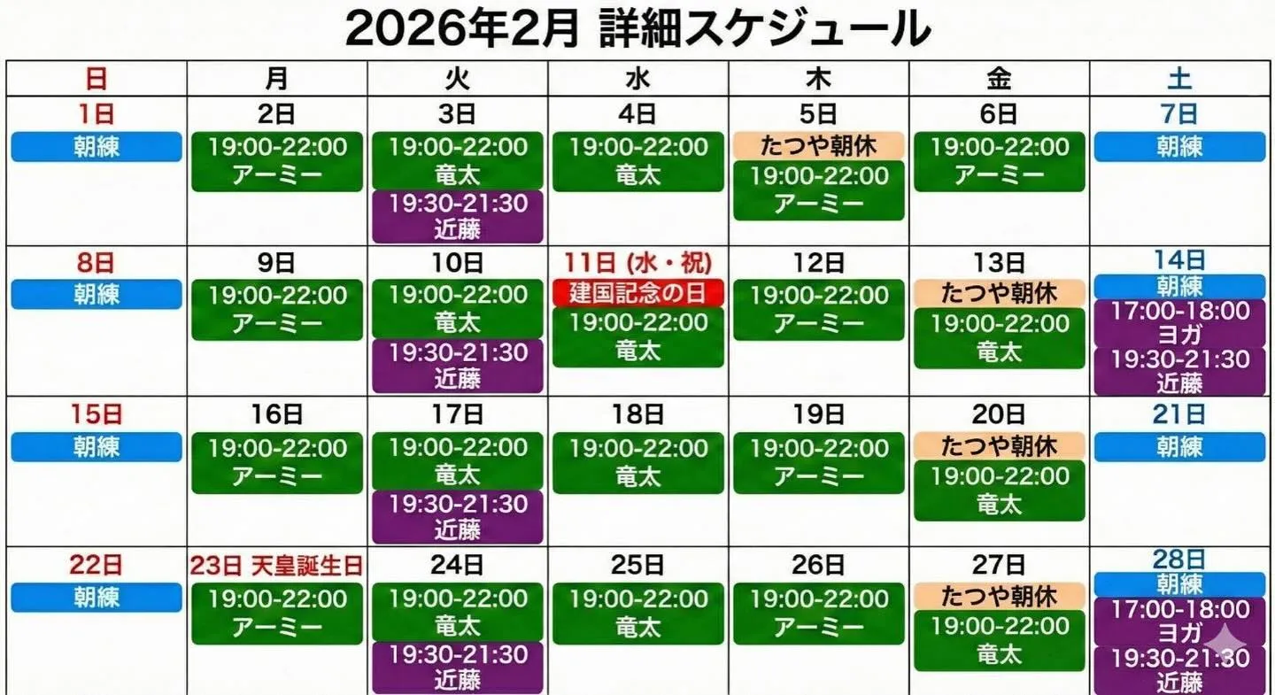 岩倉市でキックボクシング2月の予定表🥊Bull’sEyeFightingClub(ブルズアイファイティングクラブ)🌟初心者・アラフォー・女性中心に活動中!ダイエット・シェイプアップ・ストレス発散・護身術――ぜんぶキ…